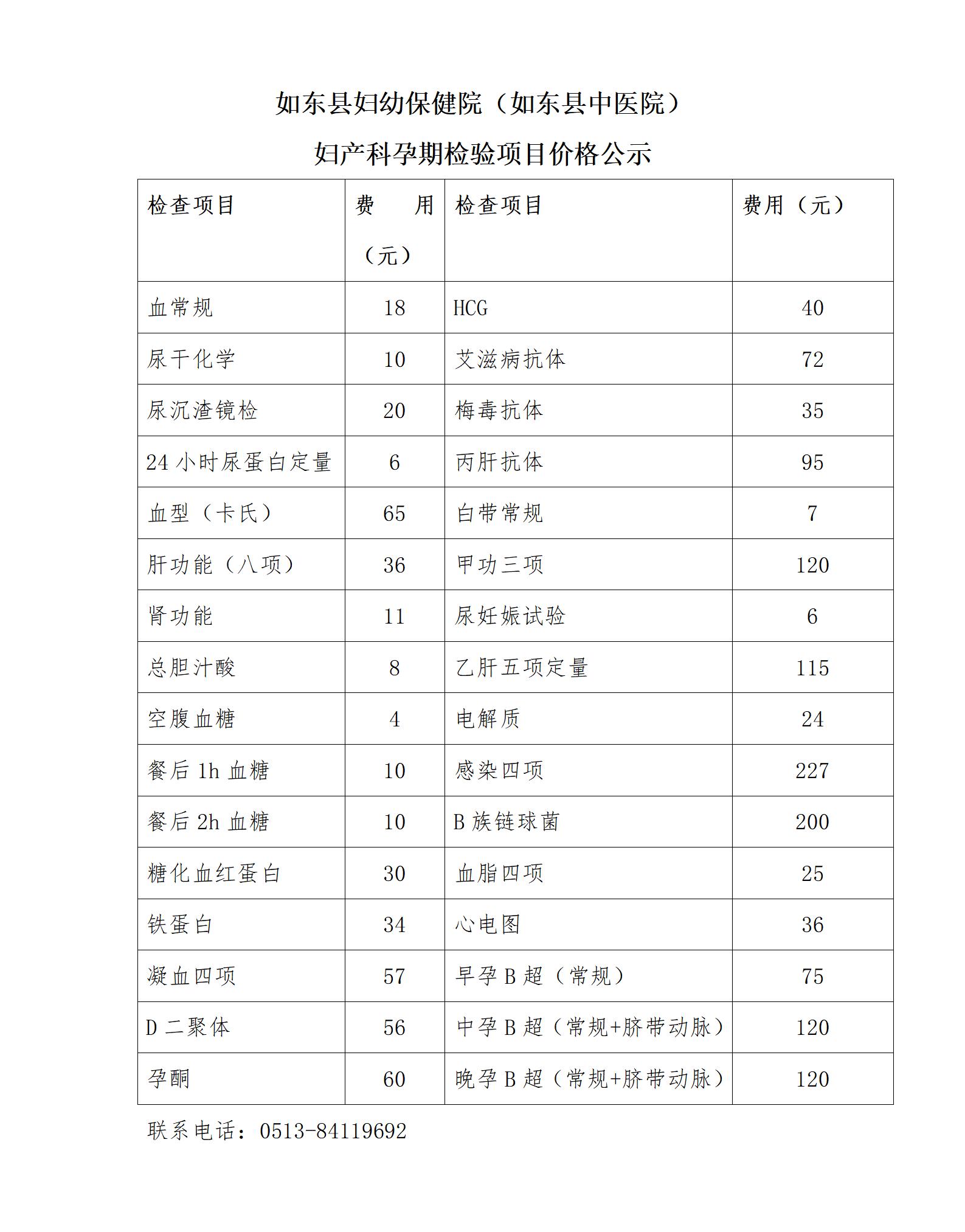 如东县中医院妇产科孕期检验价格公示、如东县妇幼公共卫生服务项目免费内容公示