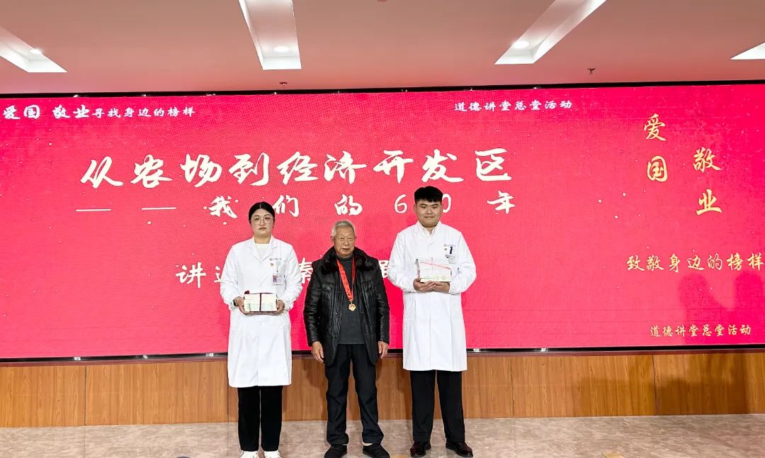 道德讲堂结束后,心病科医护为老党员测血压、血糖,进行了健康体检。团委书记李薇带领老党员一行10余人参观我院“五行”党建展览馆。